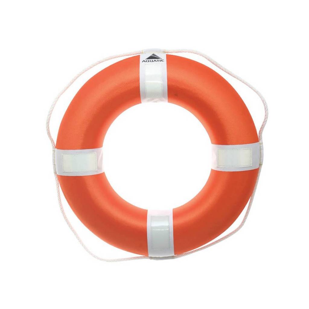 Salvavidas circular fabricado con alma de hierro, poliestireno expandido y terminación en nylon.