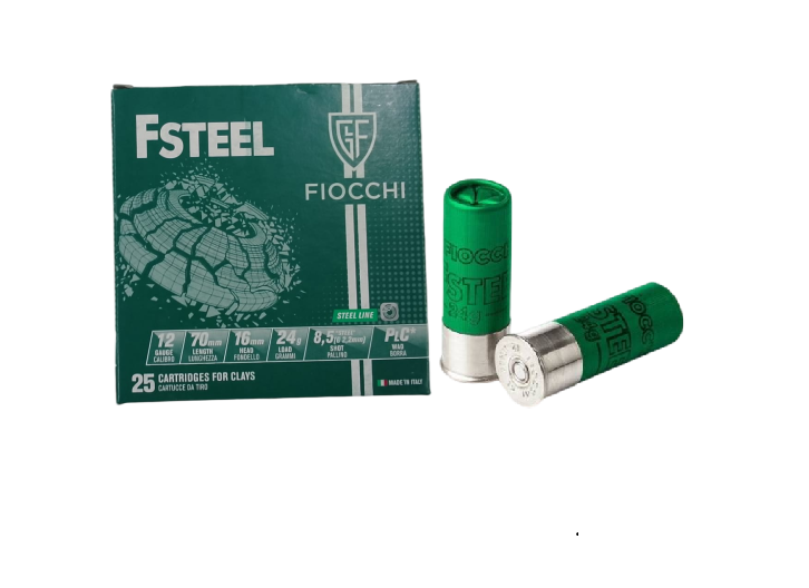 Cartucho modelo F.STEEL en calibre 12/70 de 24 gr culote de 16mm. con municion # 8.5 perdigones de acero, no contaminantes.