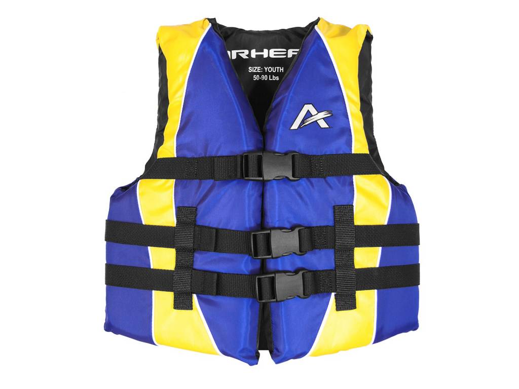 SPORTS – Chaleco Salvavidas p/ joven. PFD – Azul y Amarillo con sus lados cerrados, 3 correas ajustables. Espuma ligera EPE Juvenil hasta 55 kg. Tipo II Aprobado y Homologado por la USCG en los EEUU.