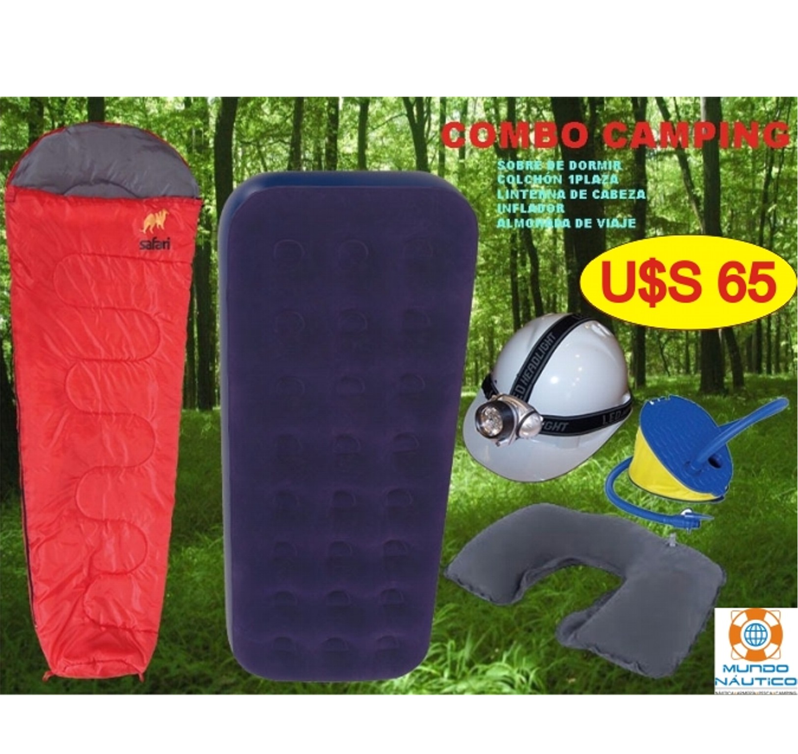 Combo Camping : Colchón+Sobre dormír+Almohada+Linterna Cabeza+Inflador
