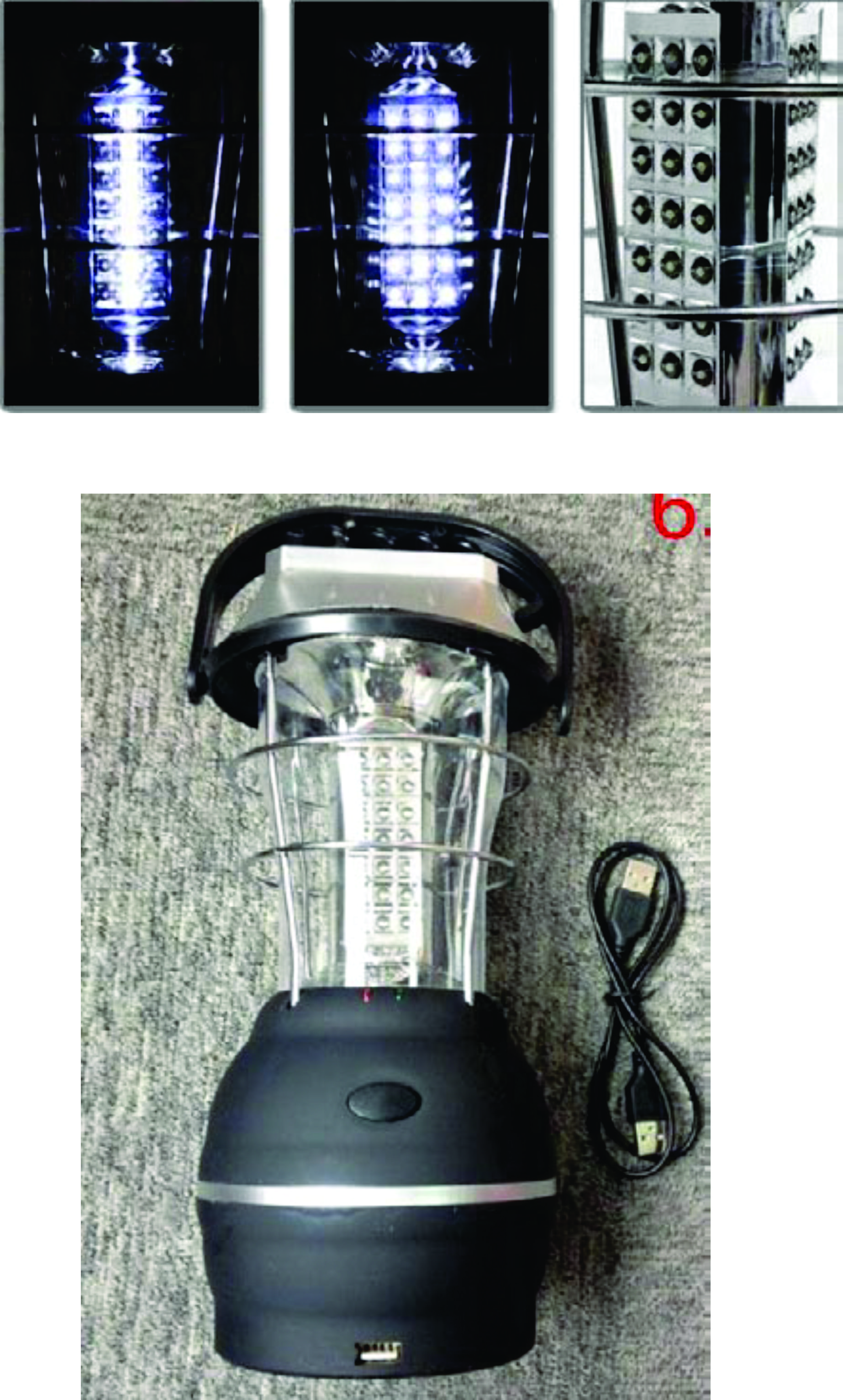 Dos opciones de encendido: 21 leds o 63 leds. Múltiple opción de recarga: Panel solar 0,6 W, 220 V, Puerto USB, a Dinamo o con 3