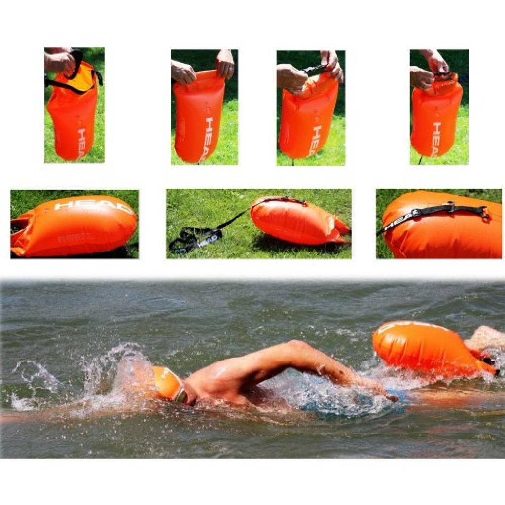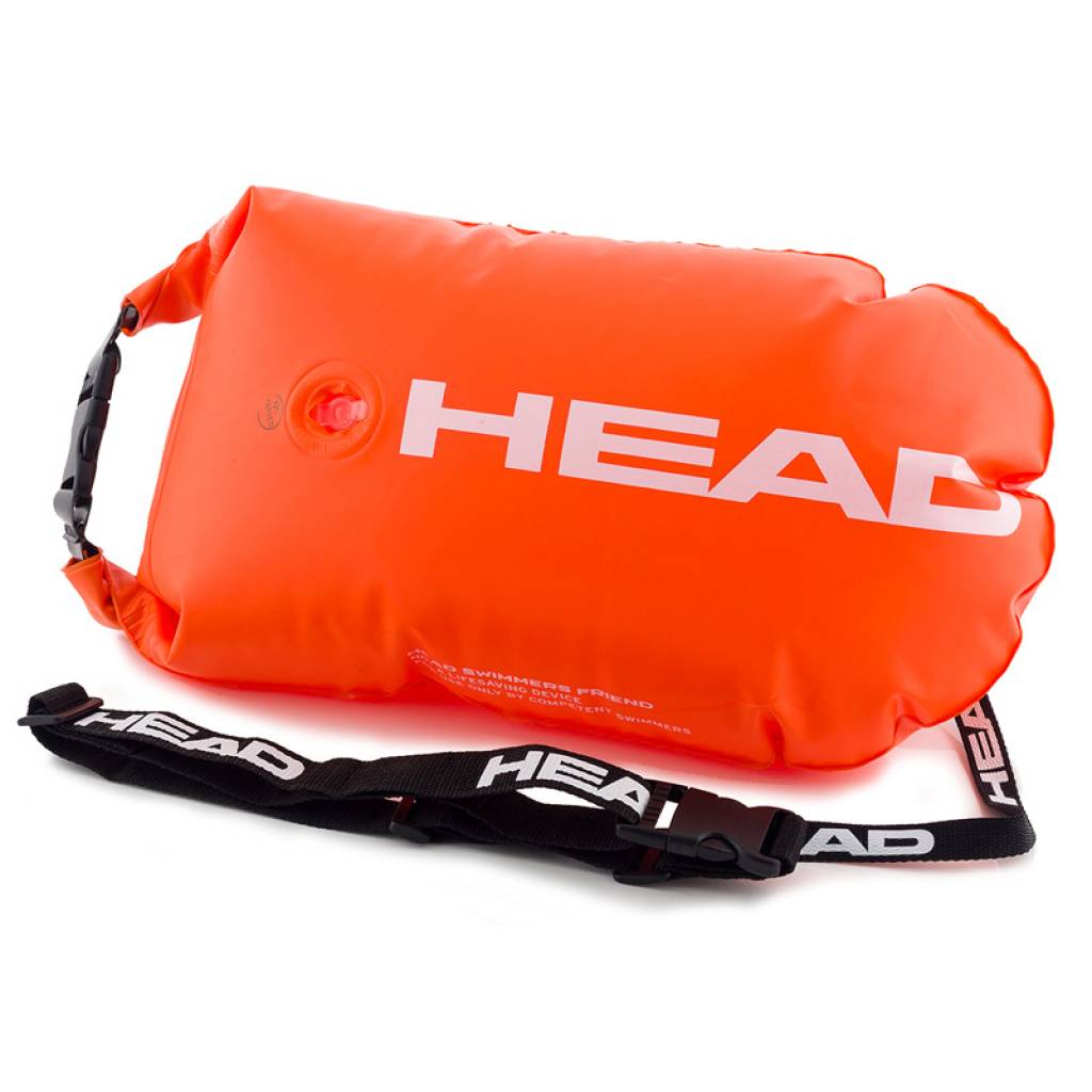 SAFETY BUOY, Boya de seguridad en color naranja muy vistoso con enganche de cintura que flota visiblemente en la parte posterior del nadador.