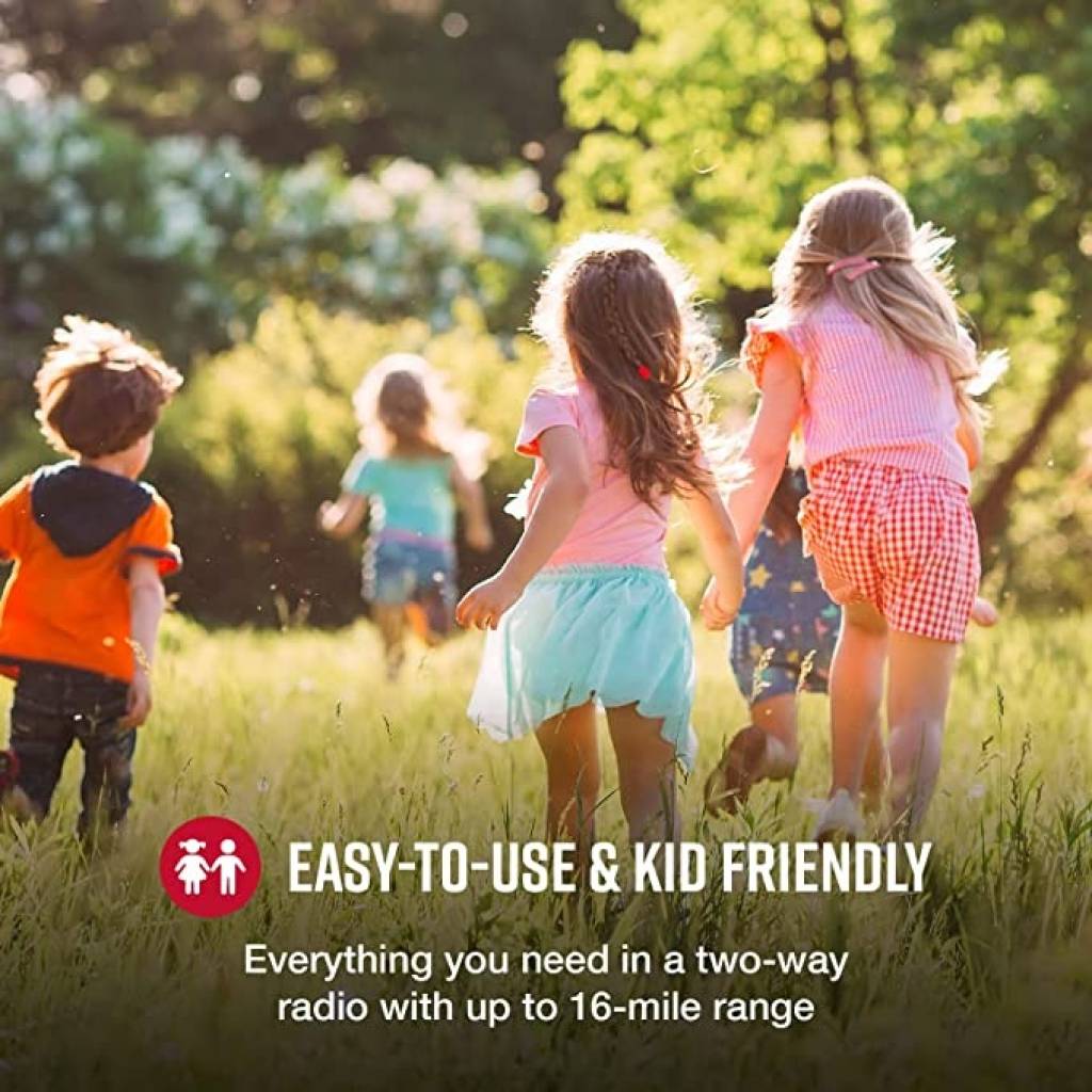 FÁCIL DE USAR Y AMIGABLE: Todo lo que las familias necesitan en un walkie talkie con un alcance de hasta 16 millas